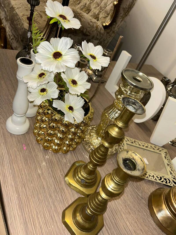 TE HUUR Met deze stijlvolle goud-witte decoset geef je jouw evenement een warme, luxe sfeer. Perfect voor bruiloften, diners of ceremonies waarin licht en elegantie samenkomen.- Kandelaren goud - Kandelaren wit - Theelichten goud en wit - Vaas goud