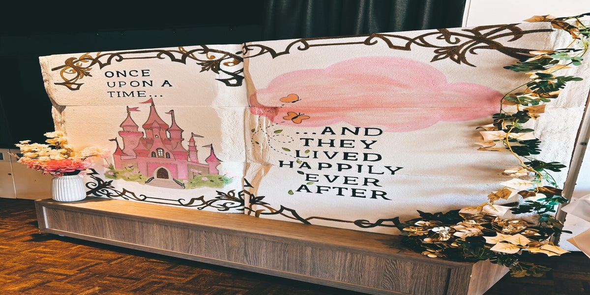 Voor de ceremonie creëerden we een echte eyecatcher: een handgemaakte backdrop in de vorm van een open sprookjesboek, waarin de eerste woorden van hun eigen liefdesverhaal stonden geschreven. Met zachte pasteltinten, gouden accenten en sierlijke details brachten we een dromerige, elegante sfeer tot leven. Bloemen in zachte rozenkleuren maakten het geheel af — klassiek met een magisch randje.
